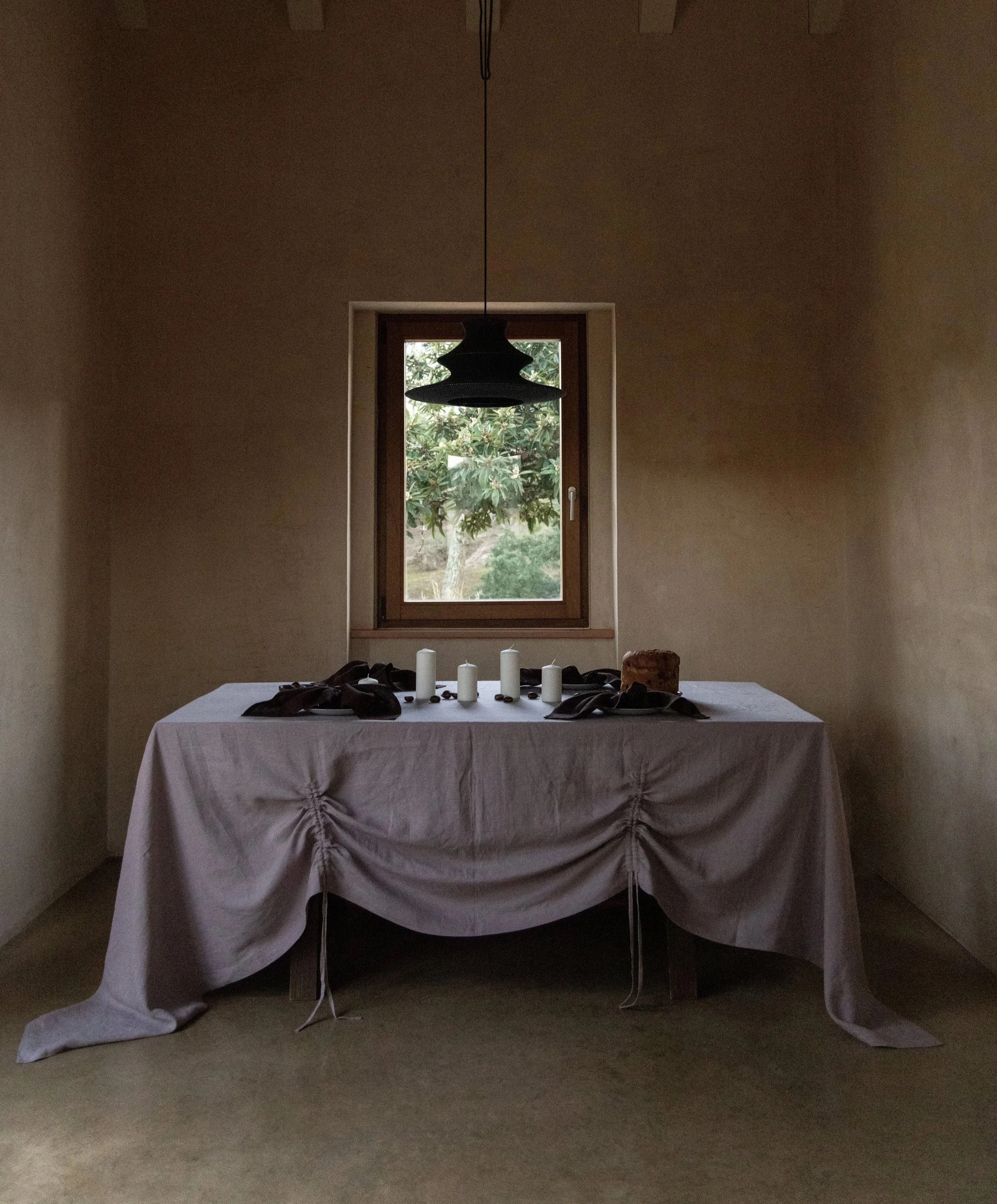 A unique handcrafted tablecloth designed with four corner openings made for tying a ribbon bow on each side. Made from rich brown linen, it brings a warm, grounding tone to any table setting. You can choose your preferred ribbon style — a classic blue gingham bow or a matching brown linen bow — and change them whenever you wish to suit the mood or occasion.