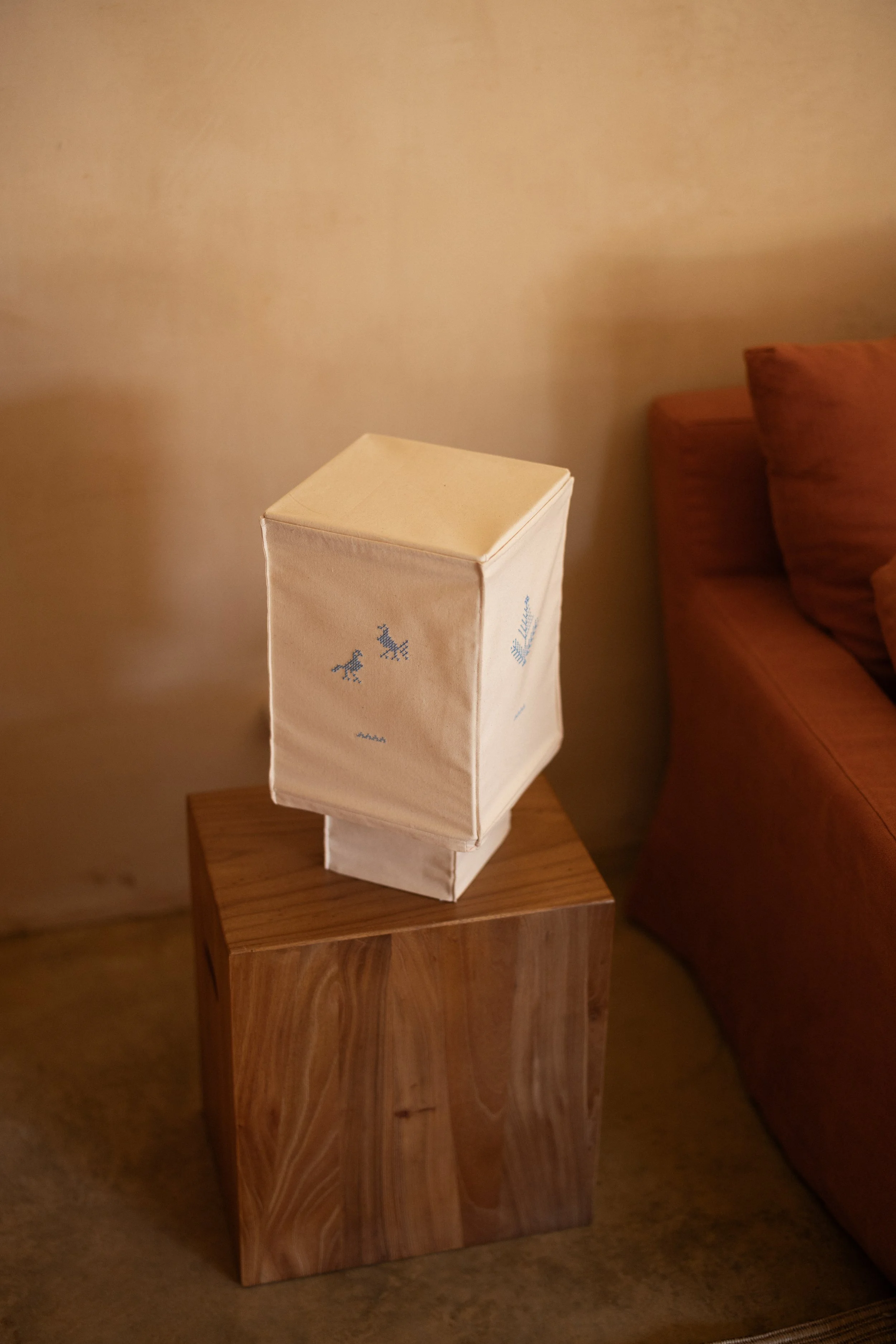 Handcrafted cotton lamp featuring floral and bird cross-stitch embroidery inspired by traditional folk motifs. This limited edition piece is inspired by the quiet beauty of winter light, bringing warmth and a soft glow to the interior. Each side of the lamp features a different symbolic motif, adding depth and character to the design. A vintage-styled cord and metal base complete the timeless look.